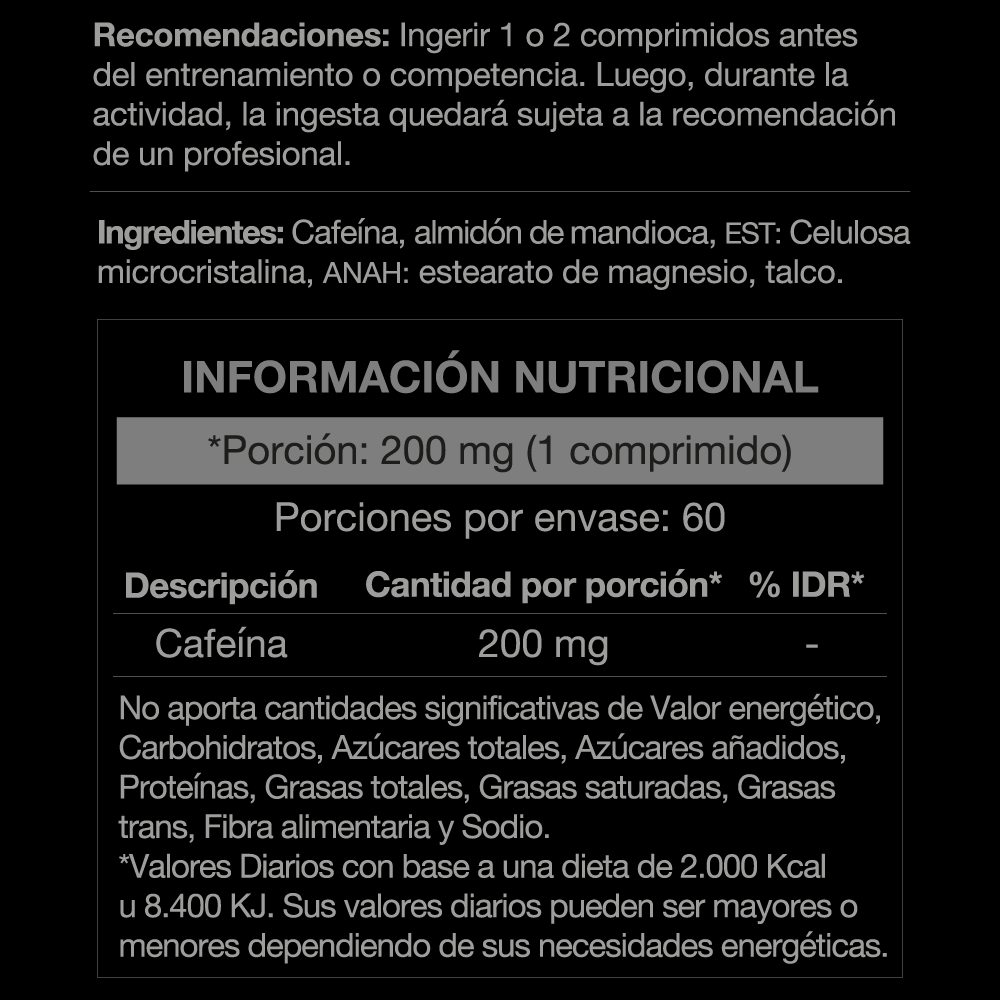 | Ingredientes | Cafeína, almidón de mandioca, EST: Celulosa microcristalina, ANAH: estearato de magnesio, talco. |