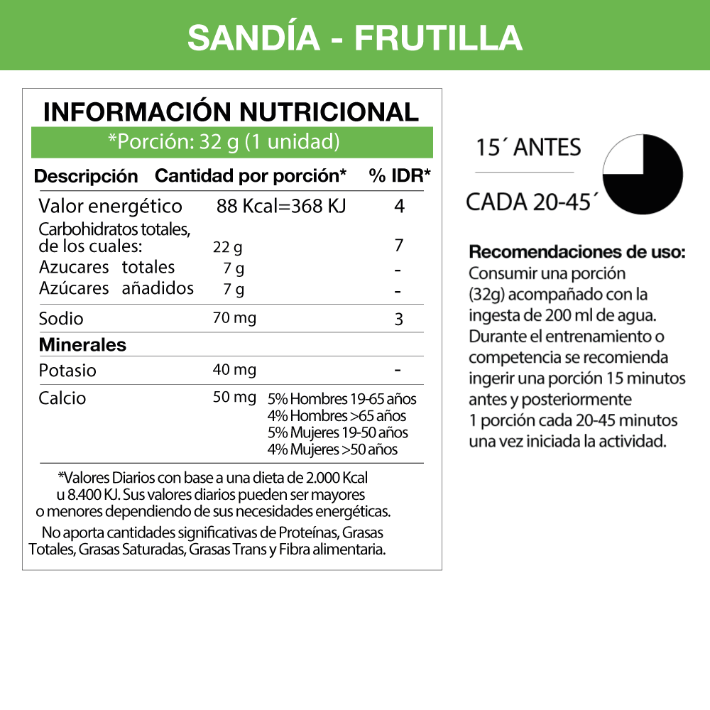 5 geles sabor Sandía – Frutilla con maltodrextina y fructosa. Sin aminoácidos ni cafeína.