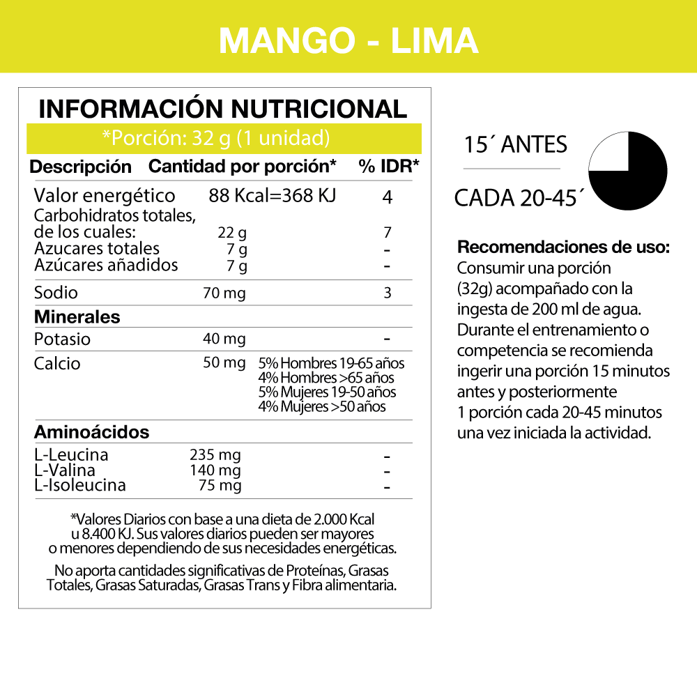 5 geles sabor Mango – Lima con 450mg de aminoácidos, maltodextrina y fructosa. Sin cafeína.