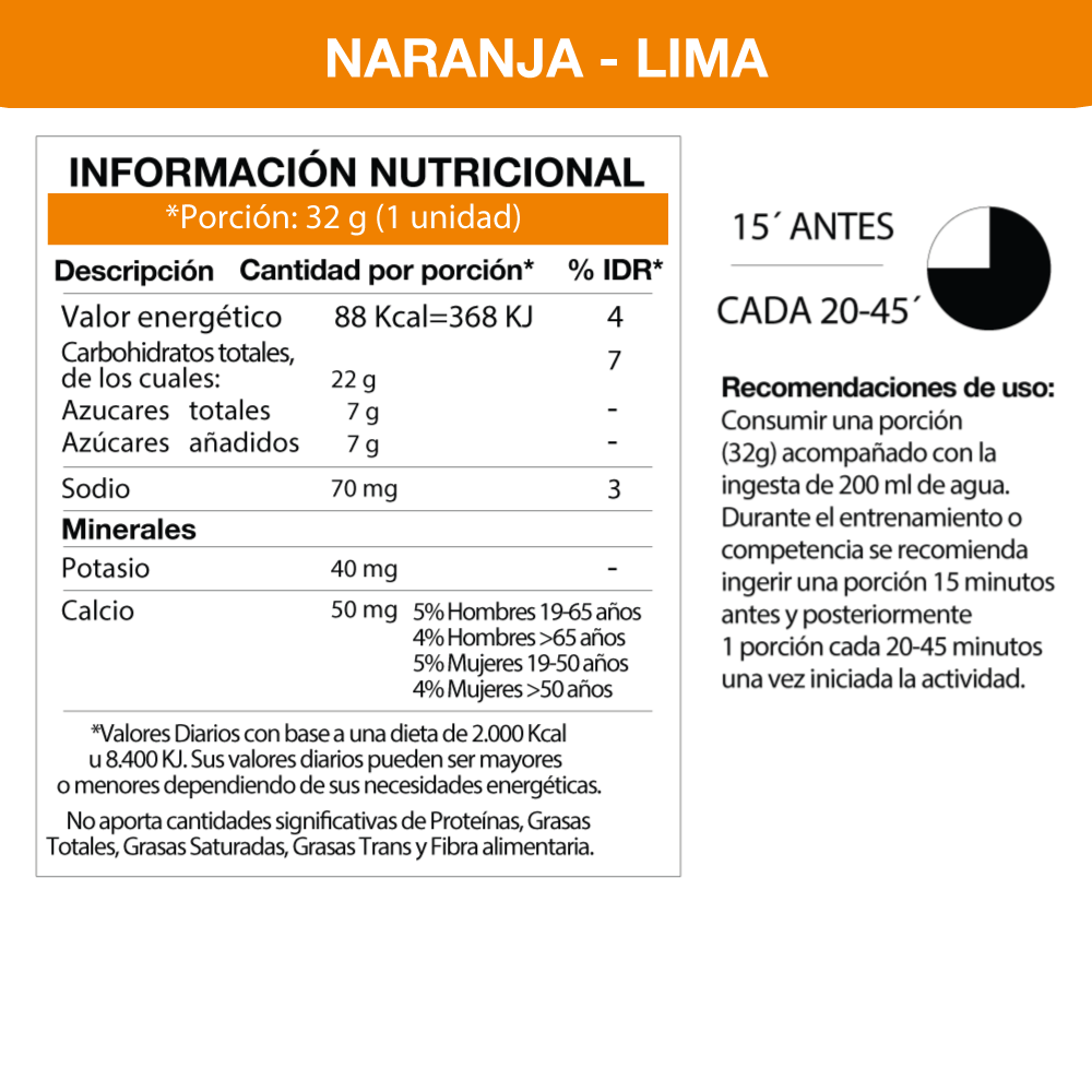 4 geles sabor Naranja – Lima con maltodextrina y fructosa. Sin aminoácidos ni cafeína.